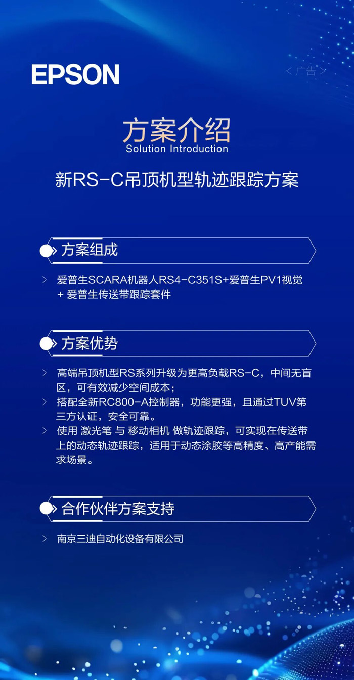 升级版高负载吊顶机型RS-C,搭配爱普生PV1视觉和传送带跟踪套件,可实现动态轨迹跟踪,适用于高精度、高产能需求场景。