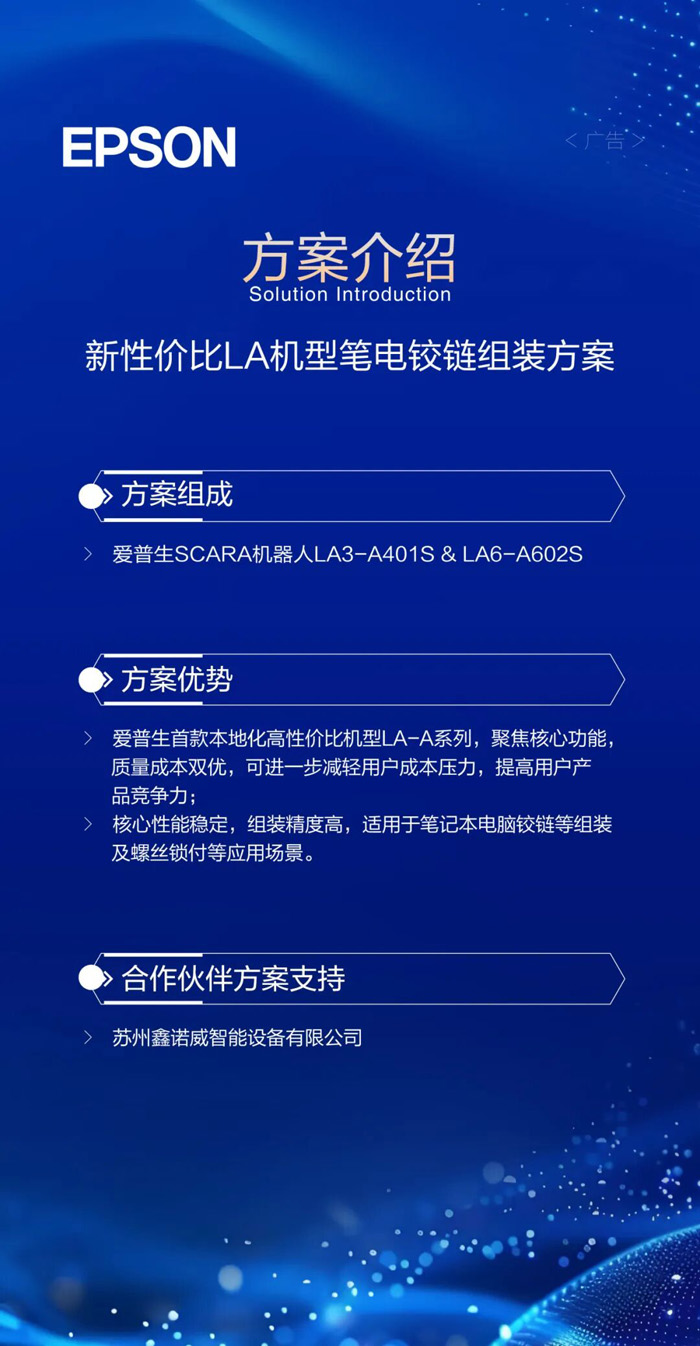 爱普生首款本地化高性价比机型LA-A系列,为用户提供质量成本双优解,可广泛应用于笔记本电脑铰链组装及螺丝锁付等场景。