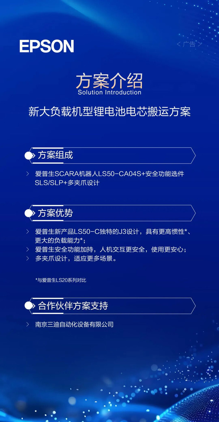 爱普生新品LS50-C具有独特J3设计,较LS20系列惯性更高、负载力更强,多夹爪设计使方案适应更多场景。