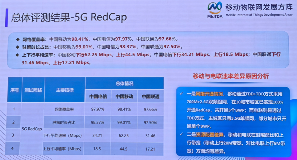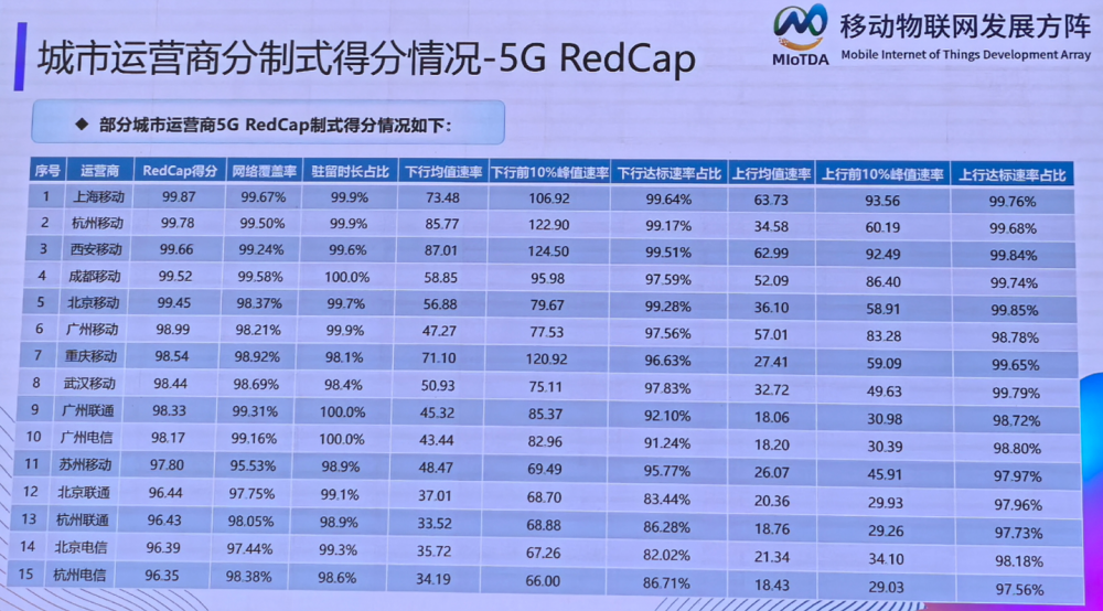 近日,中国信息通信研究院正式发布了我国首份《2025年重点交通场景移动网络质量专项评测(物联场景)》报告。报告结果显示,在备受关注的5G RedCap网络质量评测中,国内三大运营商5G RedCap网络性能提升明显,中国移动表现卓越,在十个测评城市中,独占网络质量排名前八席,以绝对优势彰显了其在移动物联网领域的领跑地位。