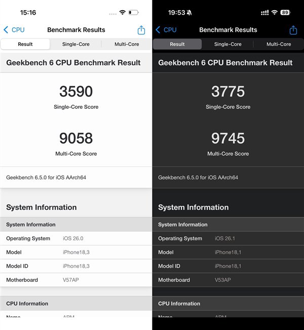 首先是CPU测试,我们选用的测试软件是最新版的GeekBench 6,测试在25摄氏度左右的室温环境下进行,测试过程中没有采用辅助散热手段,经过实测iPhone 17的单核得分为3590分,多核得分为9058分;iPhone 17 Pro的单核得分为3775分,多核得分为9745分。可以看到CPU性能方面,iPhone 17系列相比iPhone 16系列有着明显提升。