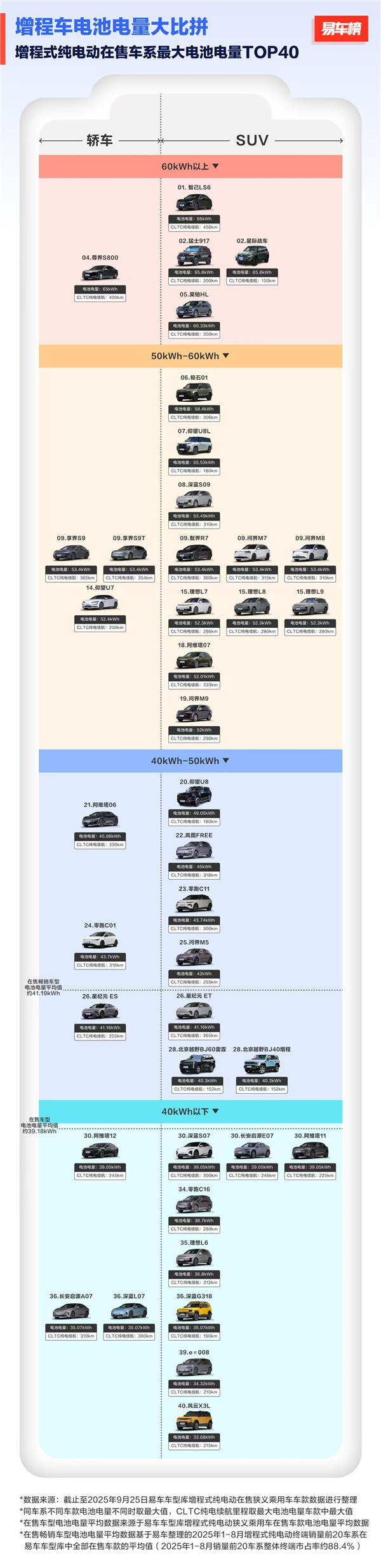低于40度电池的车型共有11款,其中轿车3款,SUV为8款,这里不再罗列,感兴趣的可看图查看。