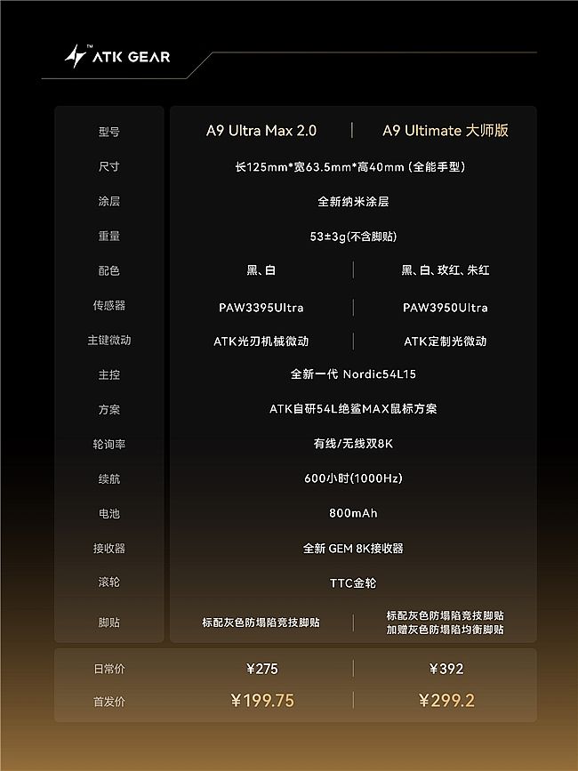 凭借更精细的模具设计、更强悍的自研性能方案,以及超长的续航表现,ATK A9大师版不仅是A9系列的进化之作,更是面向玩家的全新力作。