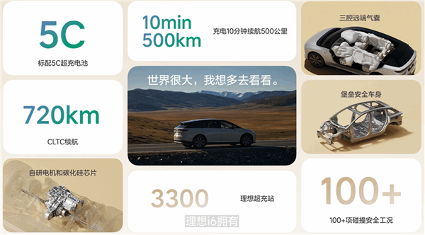 理想汽车整车电动产品负责人唐华寅介绍,理想i6配备超低内阻5C磷酸铁锂电池,峰值充电功率500kW,10分钟补能500km,10%充至95%只需要15分钟,CLTC续航里程720km。