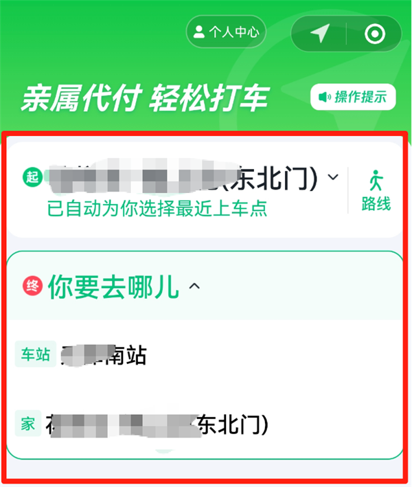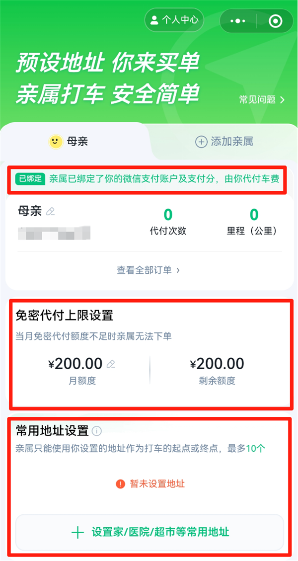 绑定完成后,子女可设置免密代付额度(默认上限200元),并添加家、医院、车站等常用上下车地点。