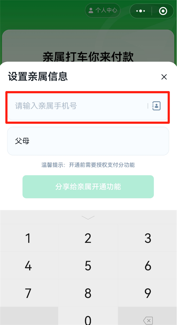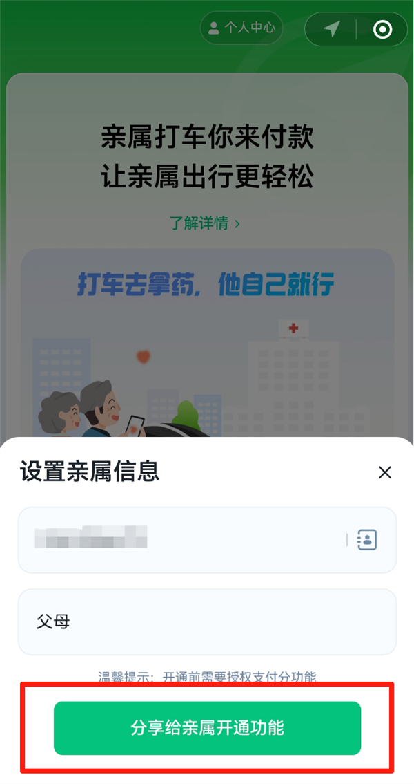 子女在微信里搜索「亲属打车」,选择「父母」作为绑定对象,填写父母的手机号和亲属关系,完成基础信息设置;