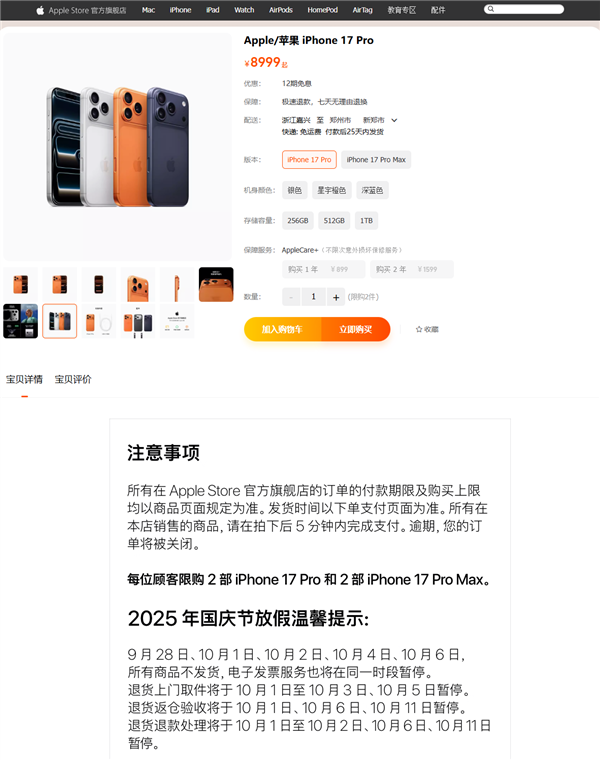 快科技9月26日消息,有在天猫苹果官方旗舰店购买iPhone 17系列的朋友要注意了,国庆期间可能收不到货!