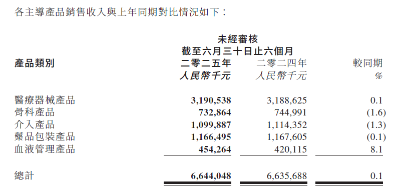 公司主要业务中,医疗器械产品上半年收入同比微涨0.1%;骨科产品、介入产品、药品包装产品收入均同比下滑;血液管理产品收入上涨8.1%。