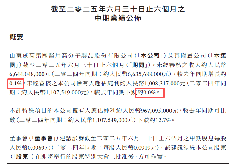 2025年上半年,威高股份盈利再次下降,实现归母净利润10.08亿元,同比下降约9.0%;不计特殊项目的公司拥有人应占纯利约9.67亿元,较去年同期可比数下跌约12.7%。
