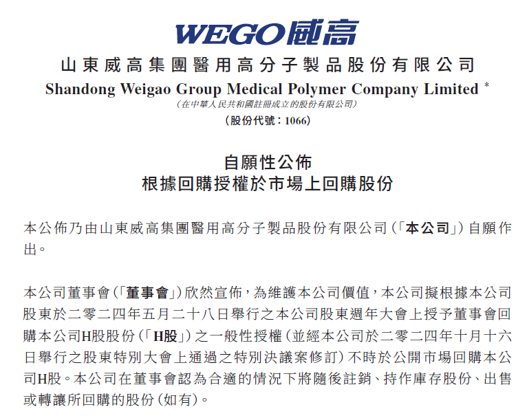 2025年2月,威高股份公告根据回购授权于市场上回购股份。公告显示,公司在董事会认为合适的情况下将随后注销、持作库存股份、出售或转让所回购的股份(如有)。