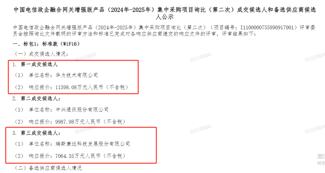 此次为项目第二次询比,9月5日,结果公示,标包1有三位成交供应商,按排名依次是华为、中兴通讯、瑞斯康达;标包2有两位成交供应商,分别是华为、中兴通讯。此外,两个标包的备选供应商都是烽火通信。