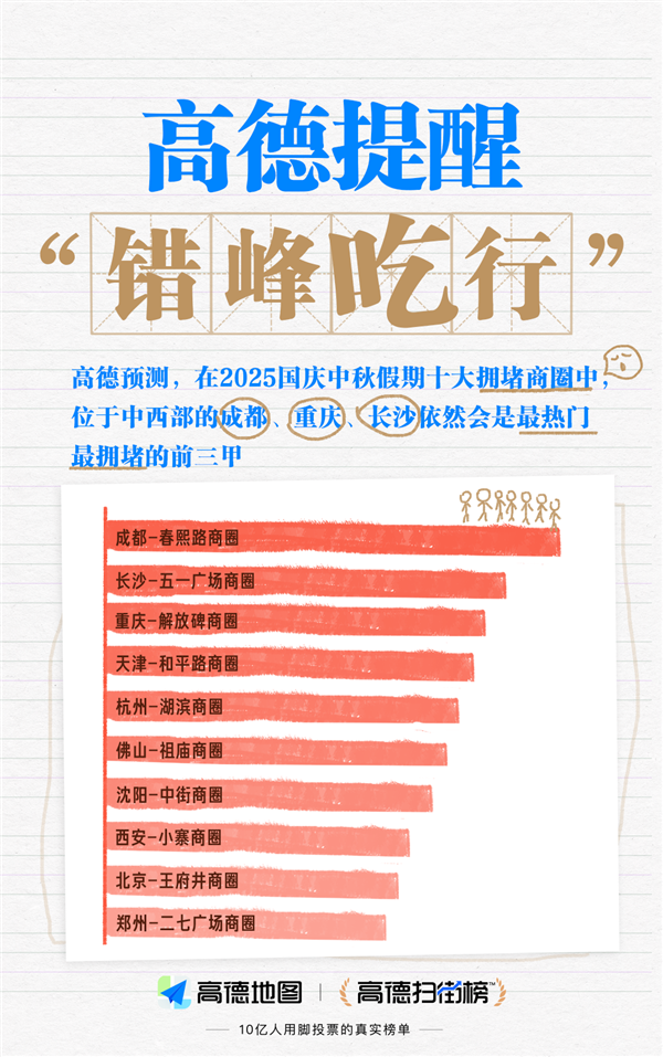 快科技9月26日消息,2025年国庆中秋假期临近,高德地图发布“扫街榜”,揭晓十大热门驾车景区与十大最堵商圈。