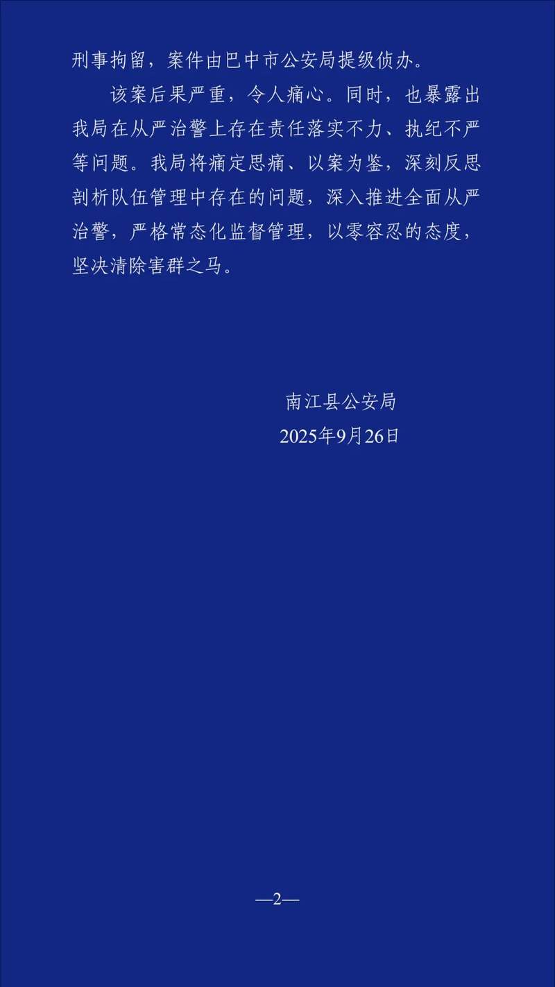 新京报讯 9月26日,南江县公安局发布警情通报,内容如下: