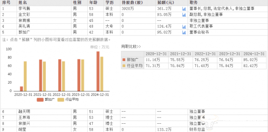 不过,与公司其他高管相比,郭加广的薪酬仍不算突出。例如,总裁李丐腾年薪为361.2万元,财务总监胡莹年薪为133.2万元。但值得注意的是,副总裁金文彩去年年薪降至93.05万元,为近五年来首次跌破百万。