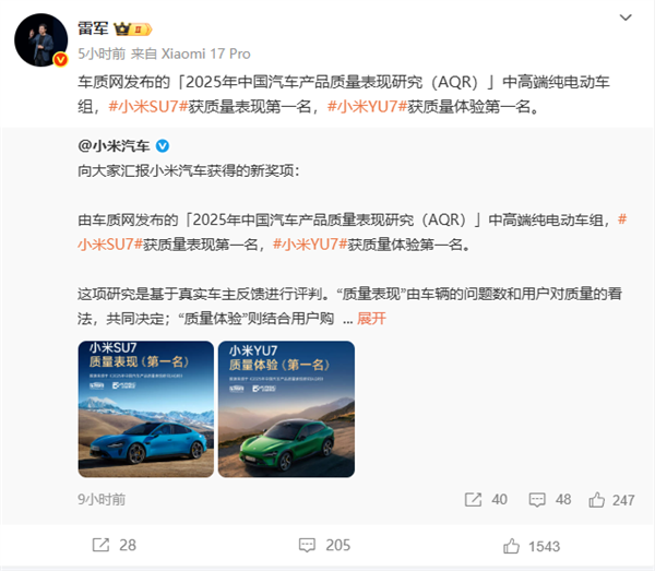 在车质网发布的“2025年中国汽车产品质量表现研究(AQR)”中,小米SU7、小米YU7均斩获第一名!