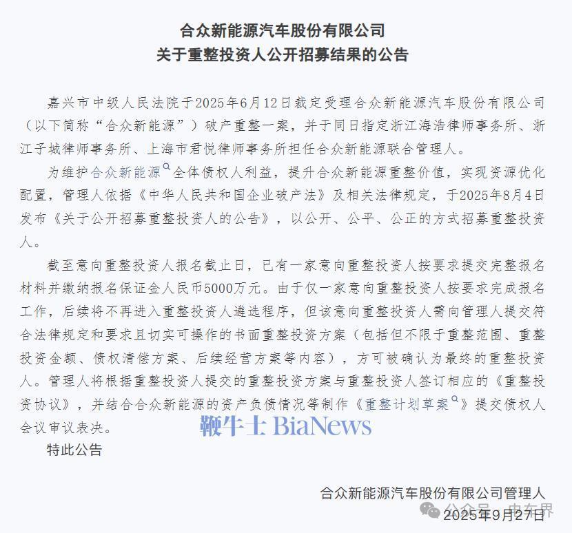 今日,合众新能源管理人发布《合众新能源汽车股份有限公司关于重整投资人公开招募结果的公告》。