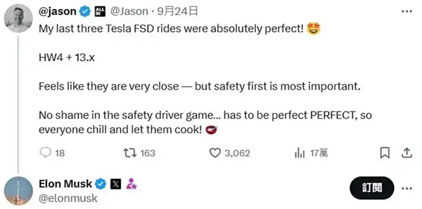 9月27日快科技消息,据汽车媒体 AutoEvolution 报道,特斯拉CEO埃隆 马斯克在X平台证实,FSD V14.0将在下周推送,相比原定的时间晚一个月。