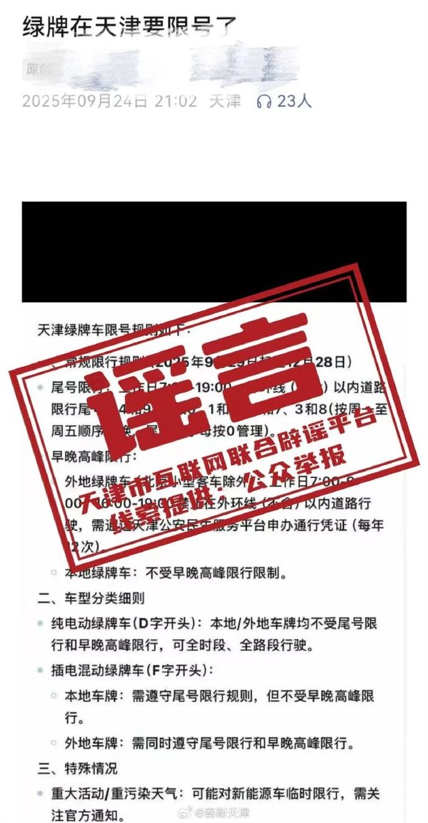 据“天津辟谣”微信公众号,近日网传“天津市新能源小客车限行政策调整”相关内容,称“天津市对插电式绿牌新能源车辆实施限行”。经向天津市公安交管部门核实,相关内容均为不实信息,按照2025年3月21日天津市公安局发布的《关于继续实施机动车限行交通管理措施的通告》,新能源小客车(以车辆登记信息为准)不受机动车尾号及外埠、区域号牌小客车高峰限行措施限制。