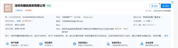 天眼查显示,深圳市疆拓商贸有限公司成立于2023年10月,注册资本是50万人民币。