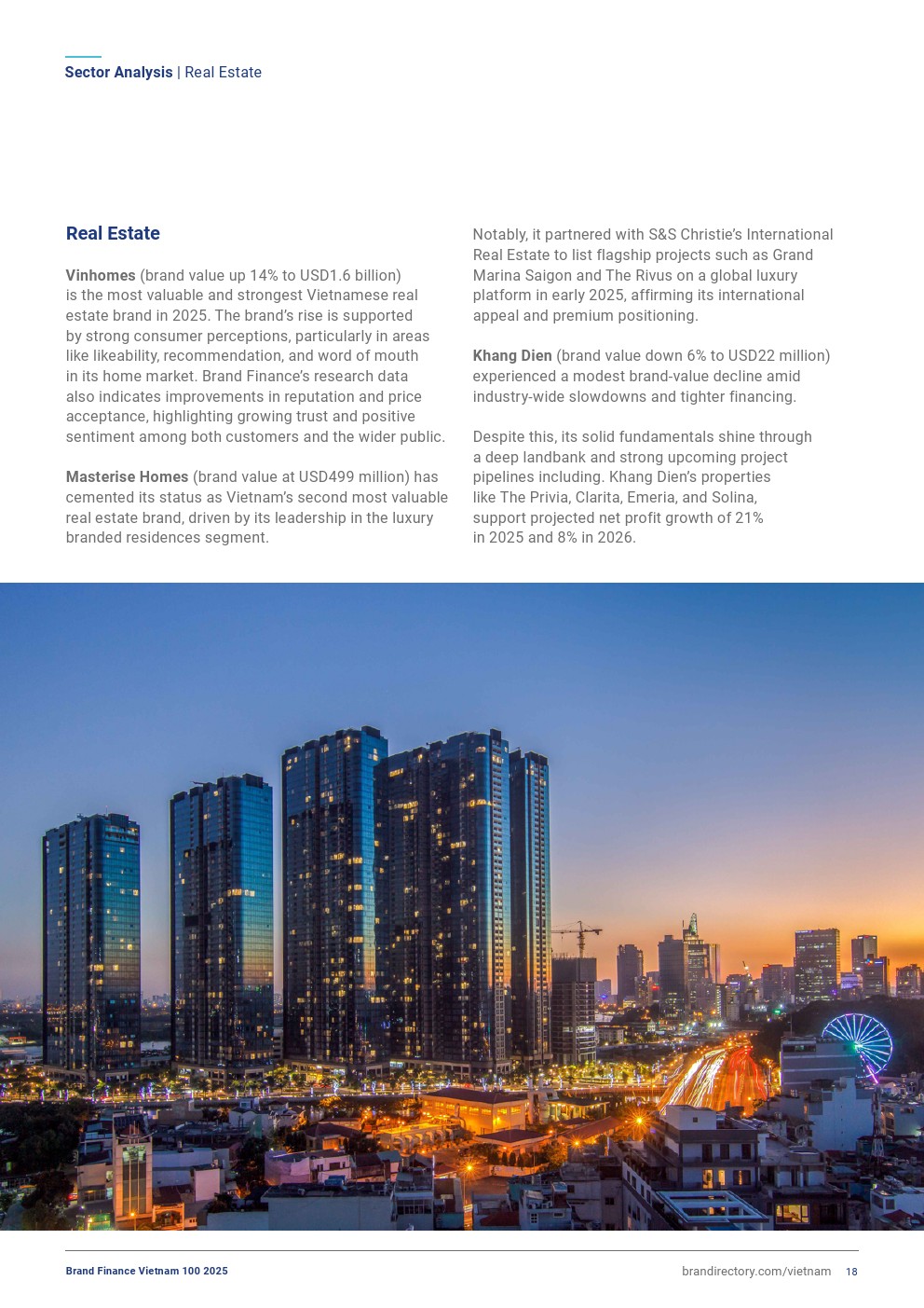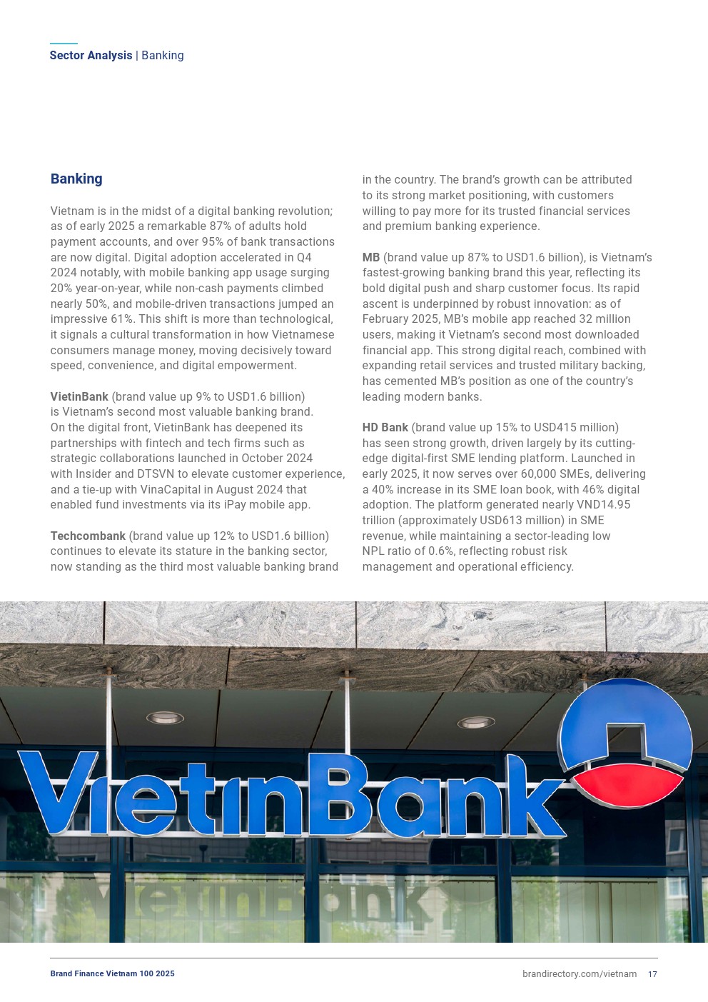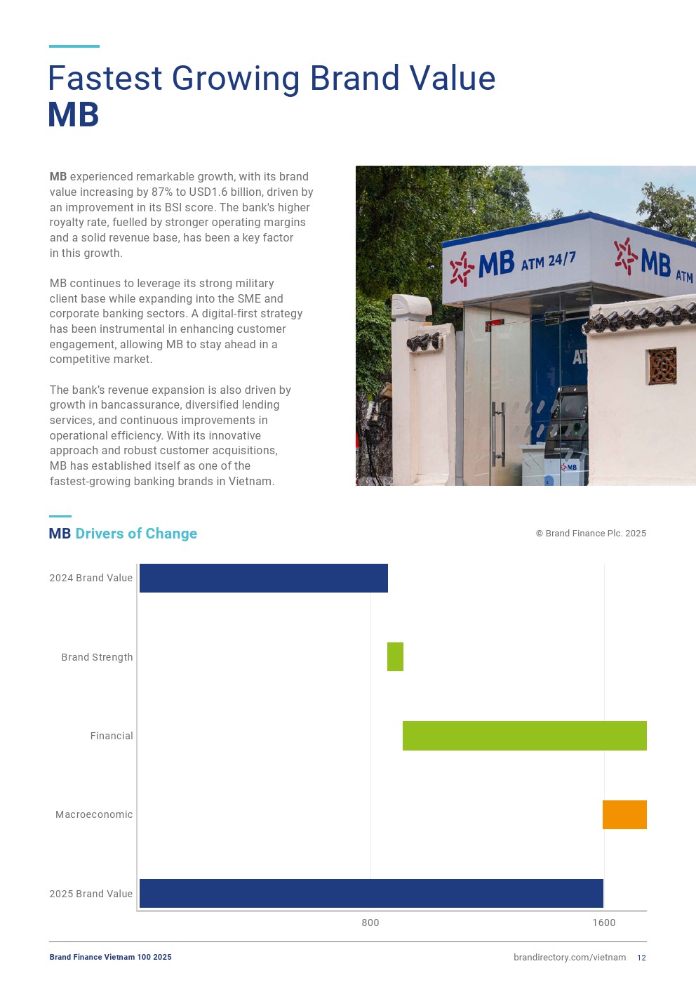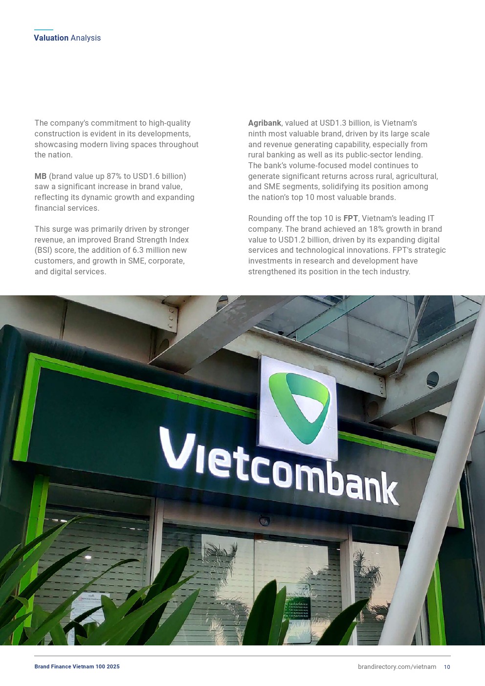 越南外贸股份商业银行(Vietcombank,品牌价值24亿美元,增长16%)位列银行业第一,增长动力源于公众信任度、品牌可见度及卓越数字化服务。越南工商银行(VietinBank,品牌价值16亿美元,增长9%)凭借强劲财务表现和行业领先盈利能力提升品牌价值。越南科技商业股份银行(Techcombank,品牌价值16亿美元,增长12%)通过数字化推进与客户群扩展跃居第五。越南投资与发展银行(BIDV,品牌价值16亿美元)保持稳定,以绿色金融领导力及资产与运营收入稳步增长巩固声誉。Vinhomes(品牌价值16亿美元,增长14%)凭借高质量房地产项目与现代生活空间实现排名上升。越南军队商业股份银行(MB,品牌价值16亿美元,增长87%)以服务扩展、数字创新及数百万新客户获取成为榜单增长最快品牌。越南农业农村发展银行(Agribank,品牌价值13亿美元)依托规模优势与农村覆盖力,在农业和中小企业贷款行业保持强劲收入。FPT集团(品牌价值12亿美元,增长18%)凭借数字服务增长与持续技术创新投资跻身前十。