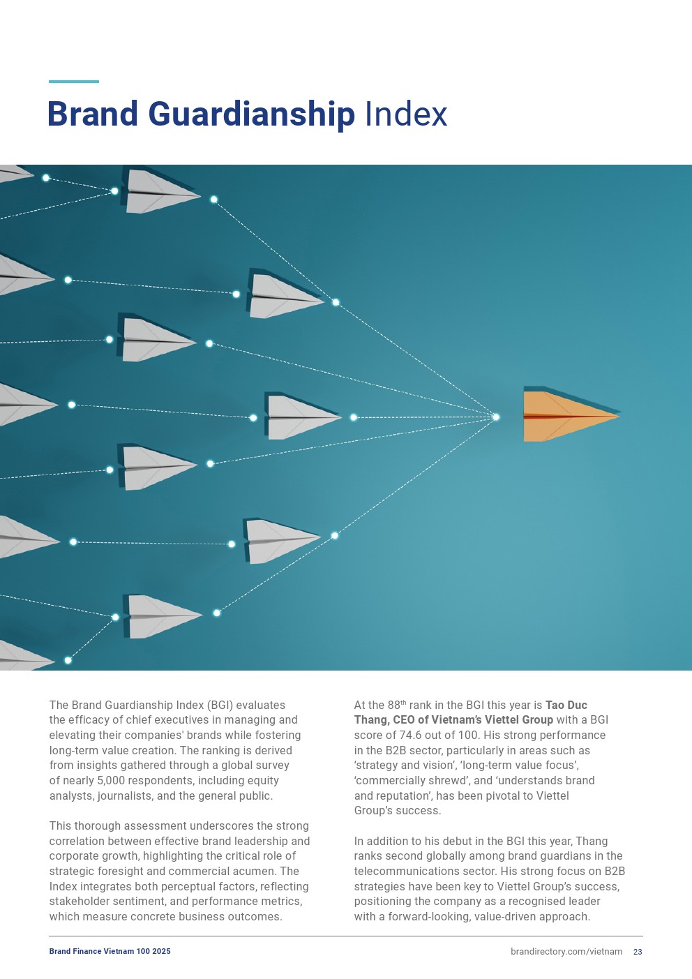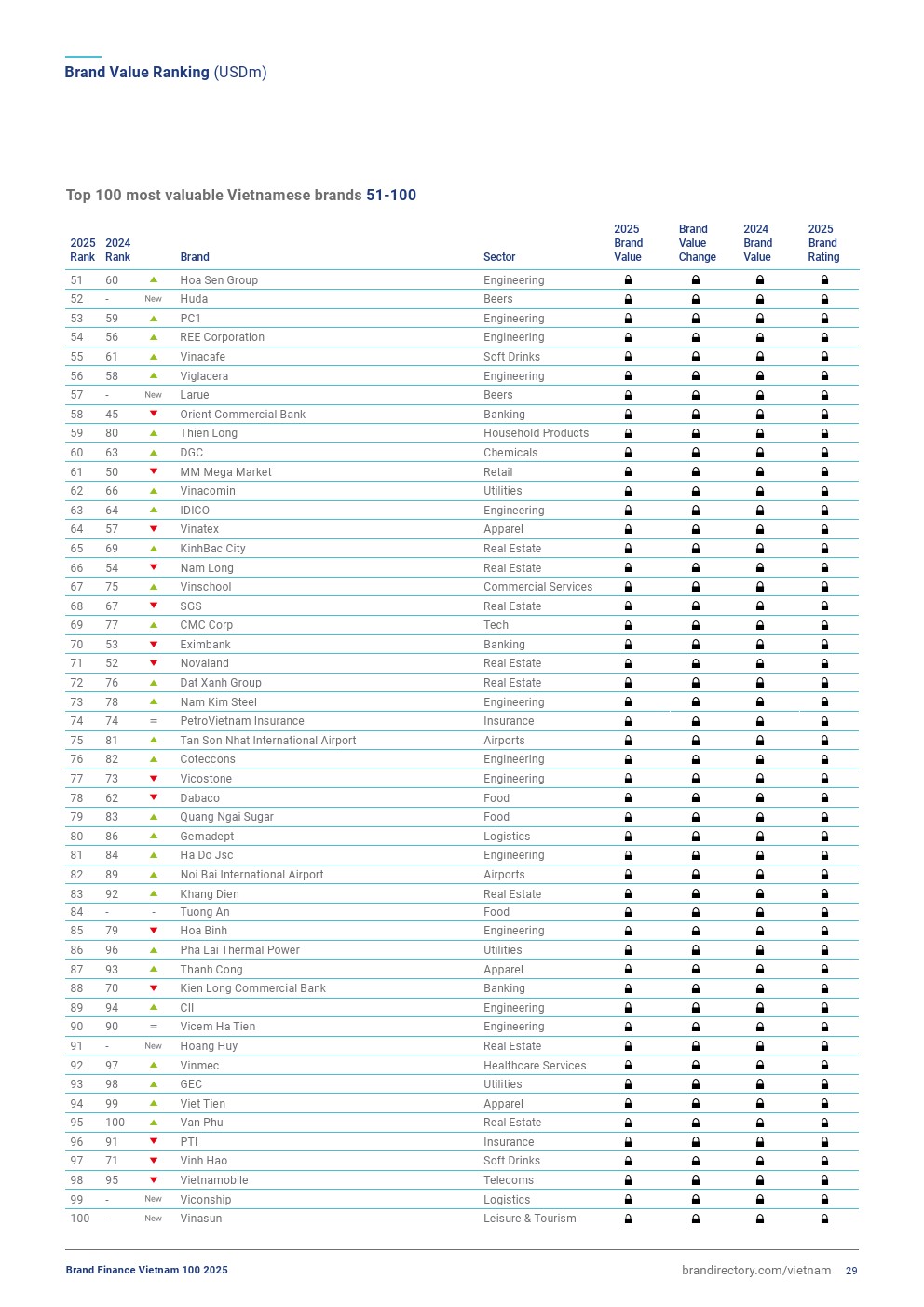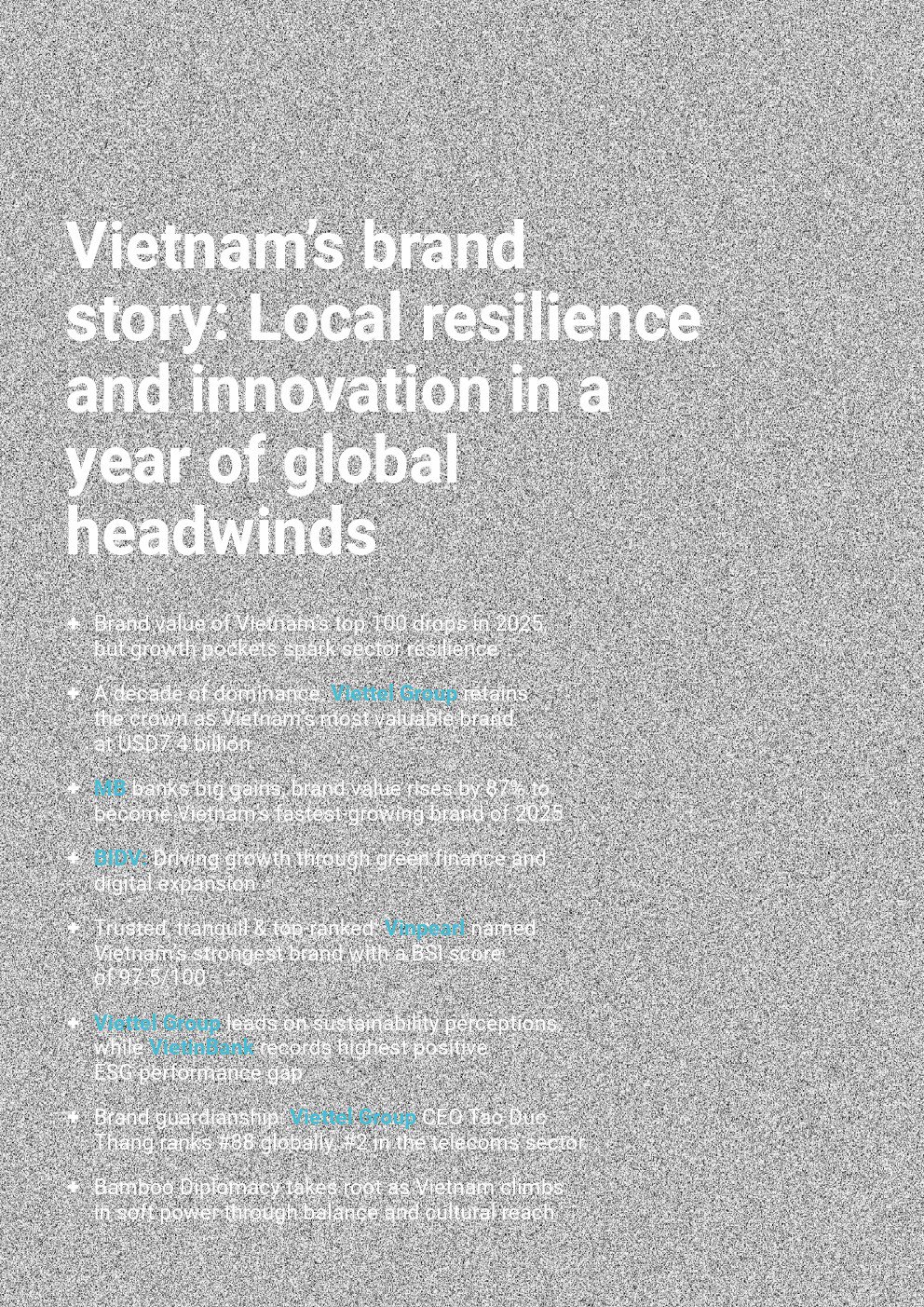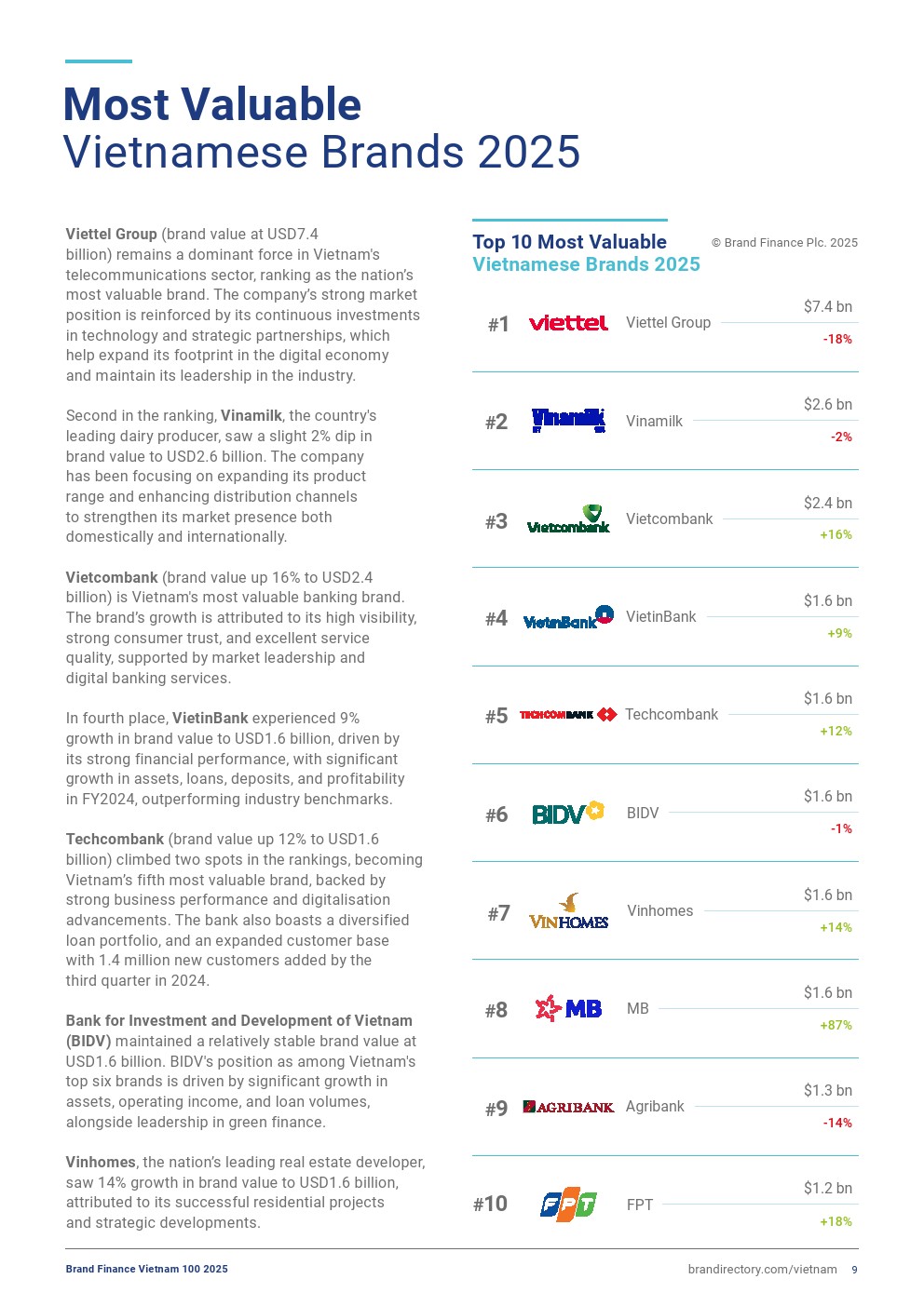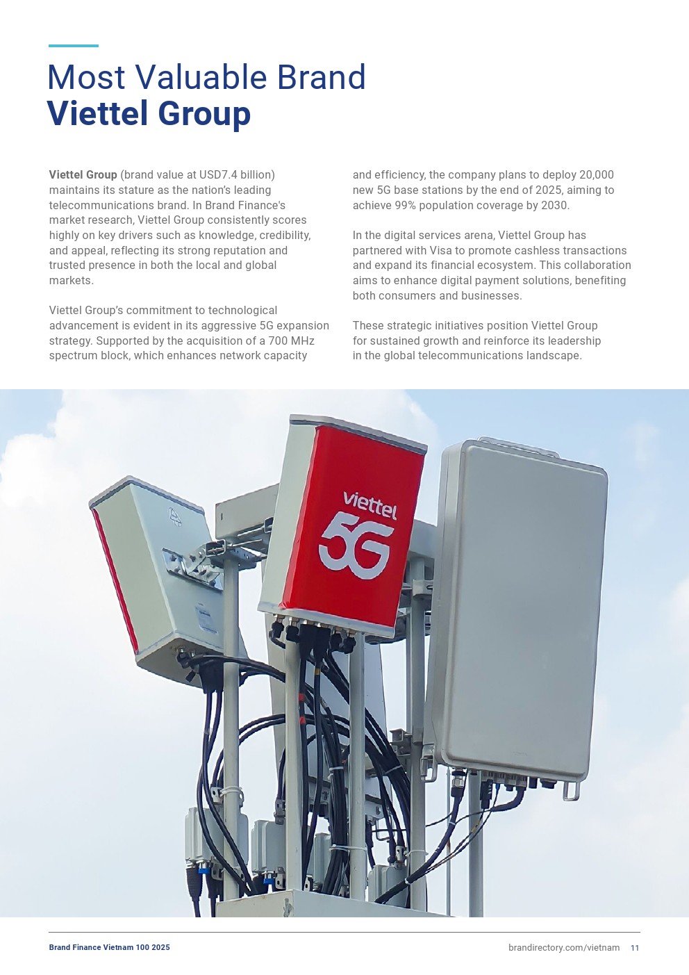 Brand Finance发布了“2025年越南品牌100强”。越南电信集团(Viettel Group,品牌价值74亿美元)持续占据越南最具价值品牌榜首,通过大力投资技术开发与战略合作,巩固其在数字经济行业的领先地位。