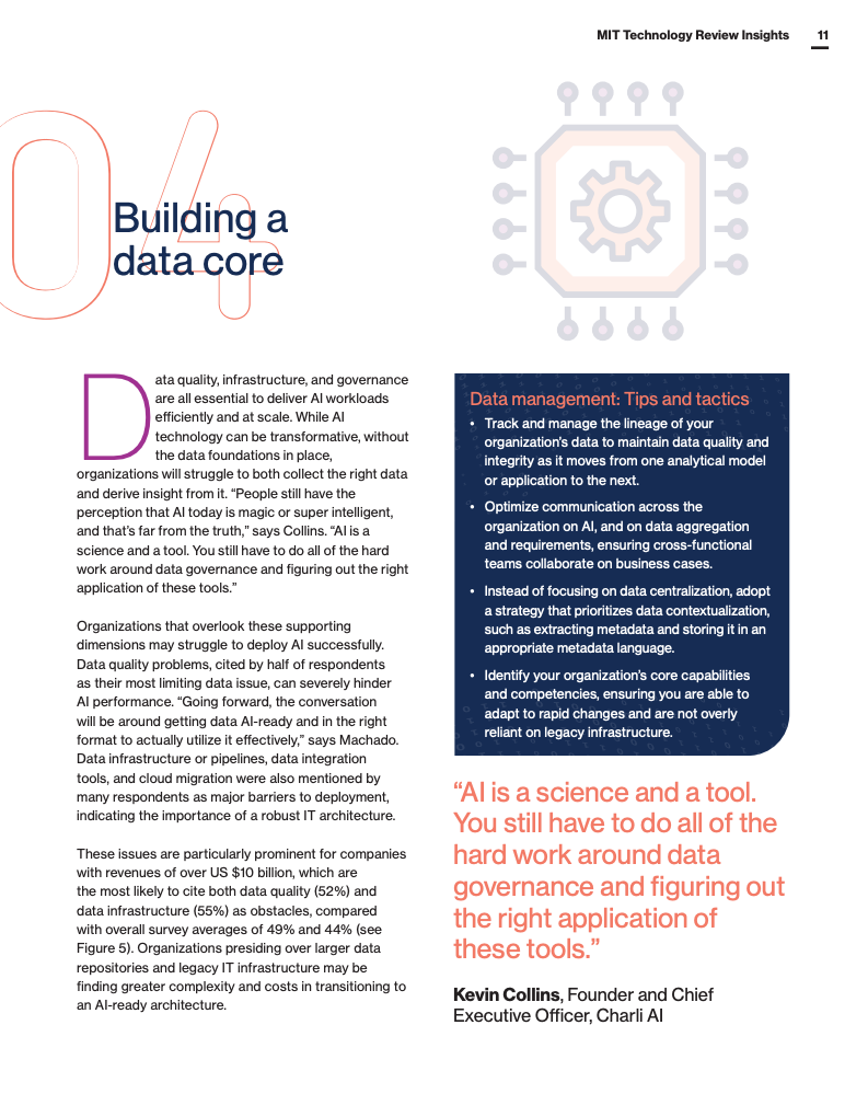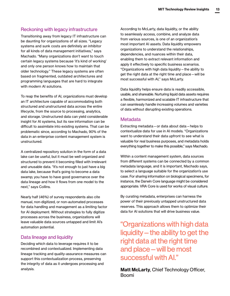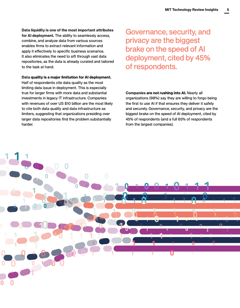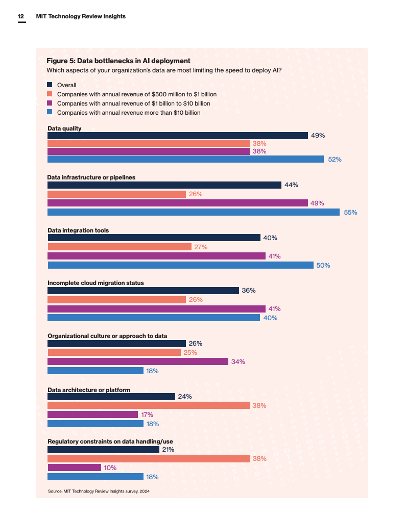 数据管理成为AI部署的核心制约因素。50%的受访企业将数据质量视为最大的瓶颈,特别是年收入超过100亿美元的巨头,这部分企业因传承IT架构和庞大数据资产而面临更大挑战。数据架构、平台及管线的弊端同样不容忽视,近一半企业反映未完成的云迁移和人工数据处理限制了AI推进。专家指出,具备数据“流动性”的企业,即数据能在不同系统间无缝访问、整合和分析者,将在AI应用中占据优势。通过实现数据血统管理和元数据抽取,企业能更有效地控制数据质量及其应用场景,提升AI业务价值。