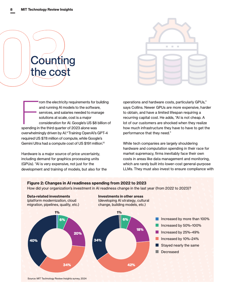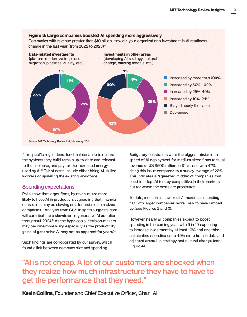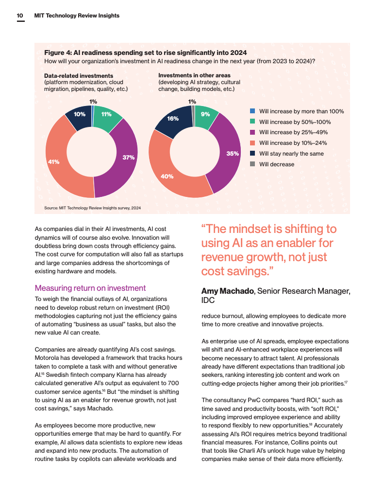 首先,企业对AI的雄心十分强烈。调查显示,95%的企业已经在某种程度上使用AI,而几乎100%的受访企业预计未来必定会采用AI。但当前多数企业仅在一至三个业务场景中部署AI,部分中大型企业计划两年内实现全业务职能的AI覆盖,2024年也被视为打牢企业AI基础的关键年。为此,投入大幅增长已成为共识。过去两年间,企业的AI相关支出较为平稳,仅有四分之一企业增加了25%以上的预算。2024年则有90%的受访者计划提高在数据准备、平台现代化、云迁移、数据质量以及战略和文化变革等方面的投入,其中超三分之一预计预算增长达25%至49%。