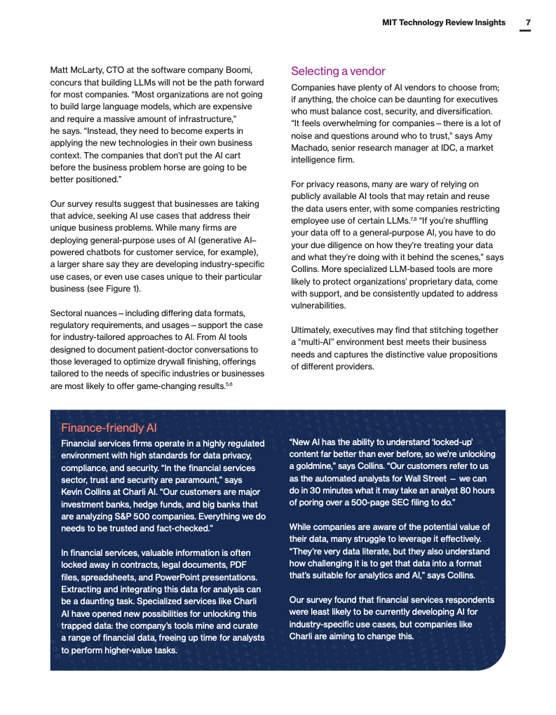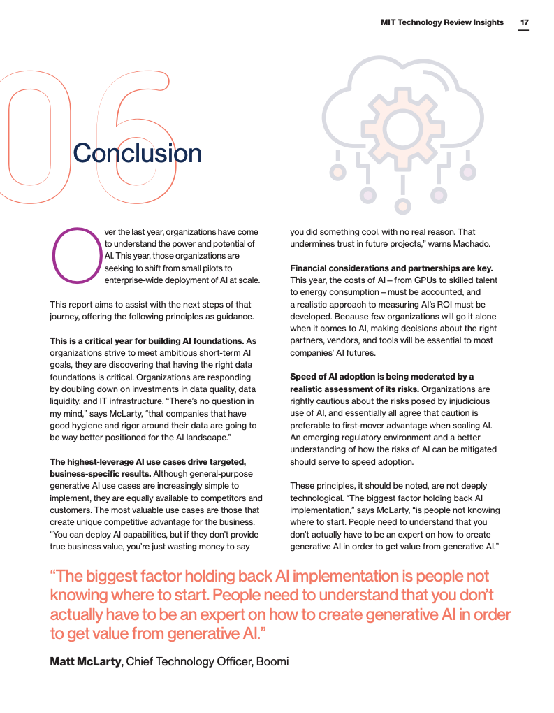 展望未来,2024年被视为企业夯实AI基础设施的关键时期。加强数据质量、加速云迁移、优化数据治理将为AI规模化应用打造稳固基石。同时,聚焦具备行业特色与业务独特性的AI应用场景,将创造更显著的竞争优势。企业应根据风险和合规形势权衡推进速度,理性看待并管理AI风险,确保安全与创新并举。AI战略的成功不在于技术上的深奥,而在于企业理解业务需求、合理选择合作伙伴和供应商,以及有效利用现成模型与工具。未来,AI将在赋能数字化转型和提升企业核心竞争力方面扮演愈发关键的角色。