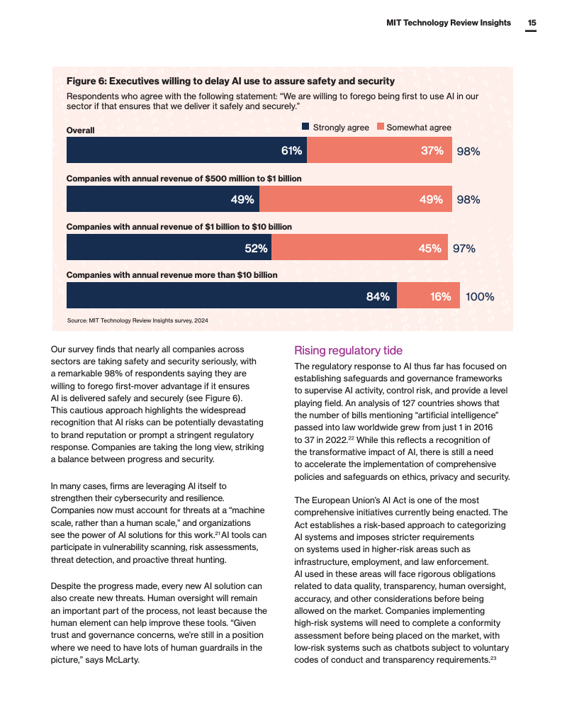 安全、治理和隐私意识则是AI推广进程中的重要“刹车”。45%的企业将这些问题列为放缓AI部署的最主要因素,尤其是大企业,有65%受访者表达了类似担忧。生成式AI带来的信息错误、偏见及法律风险加剧了企业谨慎态度。众多企业选择放弃抢先使用AI的短期优势,以确保技术安全可靠。此外,AI技术也正被用作网络安全防护工具,但人类监管依然不可或缺。监管法规接踵而至,2022年全球已有37部AI相关法案出台,欧盟AI法案和美国行政令均强化了对高风险AI应用的合规审查和透明度要求。企业在合规体系建设和AI审计方面正迎来新的挑战,合规与信任的双重要求正推动AI应用步入更加规范的轨道。