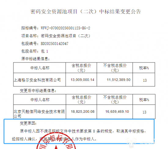 9月19日,中标结果再次变更。上海格尔安全科技有限公司同样是因为不满足招标文件中技术要求第8条的规定,被取消其中标资格,天融信网络安全公司顺延中标。