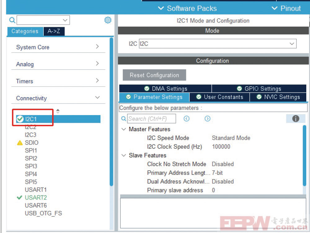 INA219的通信接口为IIC,可以使用STM32内置硬件I2C外设与INA219模块实现数据通信。