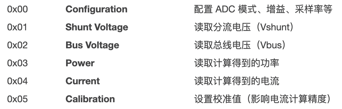 INA219通过分流电阻(Shunt Resistor)测量电流,并同时监测总线电压,计算功率:电流测量校准值电压测量总线电压(Vbus)功率计算。