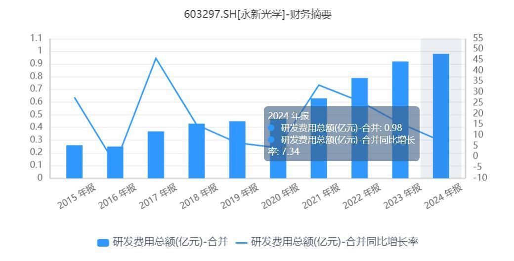 高强度的研发投入是永新光学保持核心竞争力、拓展新兴领域的关键支撑。今年上半年,公司研发投入达4720万元,占主营业务收入比重10.70%;2024年,研发投入9849.53万元,占营收比重11.33%,显著高于行业平均水平。
