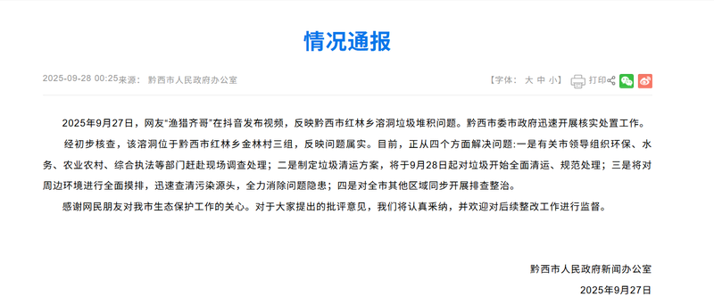 新京报讯 9月27日,黔西市人民政府新闻办公室发布情况通报,2025年9月27日,网友“渔猎齐哥”在抖音发布视频,反映黔西市红林乡溶洞垃圾堆积问题。黔西市委市政府迅速开展核实处置工作。