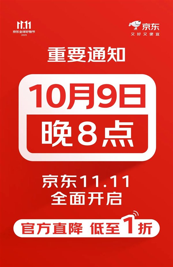 快科技9月29日消息,京东官方刚刚宣布,京东11.11购物节将于10月9日晚8点正式开启。