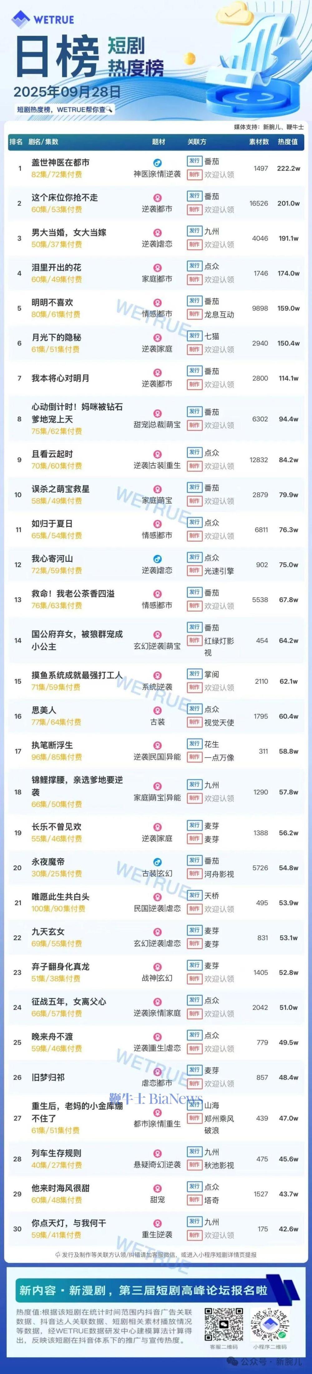 1、本日榜为WETRUE短剧数据公司提供,新腕儿和鞭牛士提供联合支持。