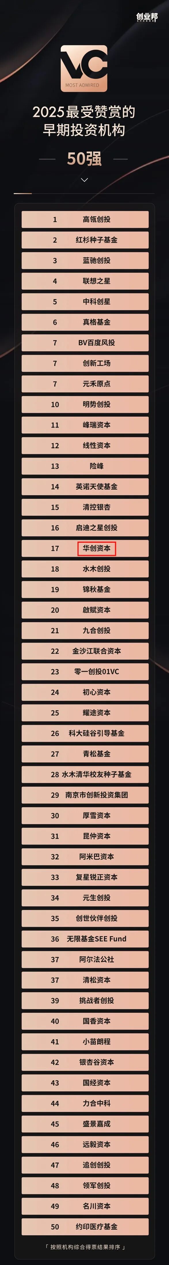 华创资本荣获创业邦「2025最受赞赏的早期投资机构」TOP 20