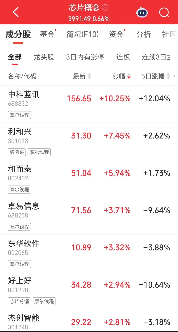 9月29日上午,多只摩尔线程概念股走强。其中,中科蓝讯(688332.SH)一度涨超13%,截至上午收盘,其涨幅回落至10.25%,报156.65元/股,市值为188.92亿元。