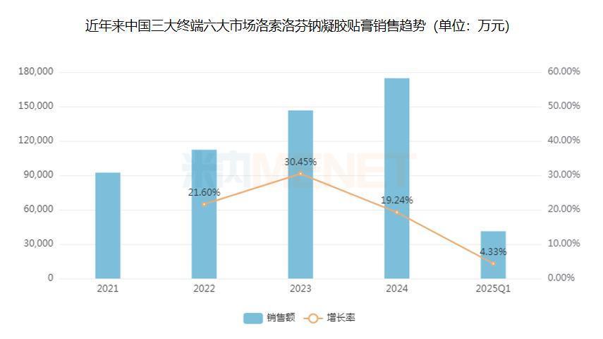 根据米内网的数据,2024年洛索洛芬钠凝胶贴膏在中国三大终端六大市场的销售规模已突破17亿元,2025年第一季度仍以4.33%的增速保持增长,庞大的市场体量为产品未来的销售提供了广阔空间。
