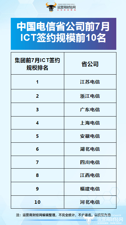 首先,截至今年前7月,ICT签约的规模排名前十的分别是江苏电信、浙江电信、广东电信、上海电信、安徽电信、湖北电信、四川电信、江西电信、福建电信和河北电信。