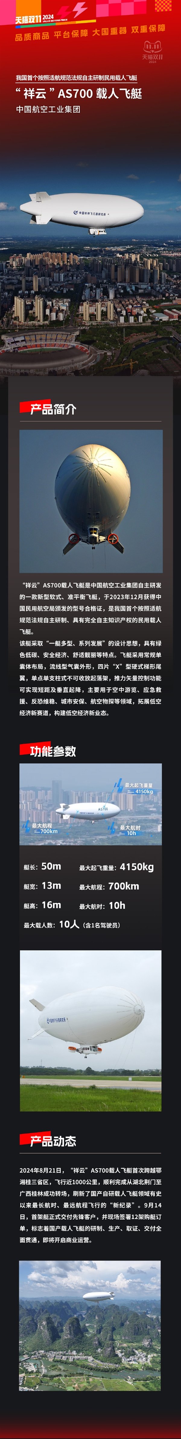 “祥云”AS700载人飞艇是中国航空工业集团自主研发的一款新型软式、准平衡飞艇,于2023年12月获得中国民用航空局颁发的型号合格证。
