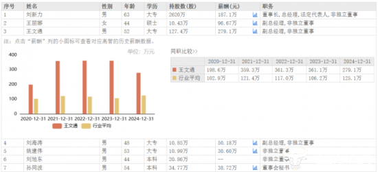 而在去年公司业绩下滑的背景下,公司部分高管薪酬却不降反增,王文通是公司为数不多薪酬下降的。王文通2024年薪酬为279.1万元,相较于2023年的361.1万元,下降了82.0万元,为公司高管中降薪最多的,但其仍为公司最高薪酬,远超其他两位副总经理,比董事长刘新力还高。刘新力薪酬由2023年的190.0万元下调至2024年的187.1万元,下降了2.9万元。