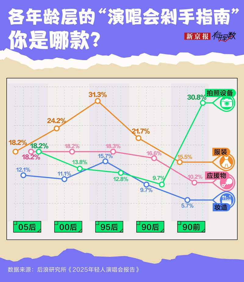 抛开交通和住宿,服装、应援物和拍照设备也是歌迷的标配。从不同年龄段来看,05后在不同细节上的花费相对平均,95后、00后和90后,更愿意花钱打扮美美地去应援。而年过35的叔叔阿姨们,则大方砸钱买设备,谁说 35 岁有中年危机了?