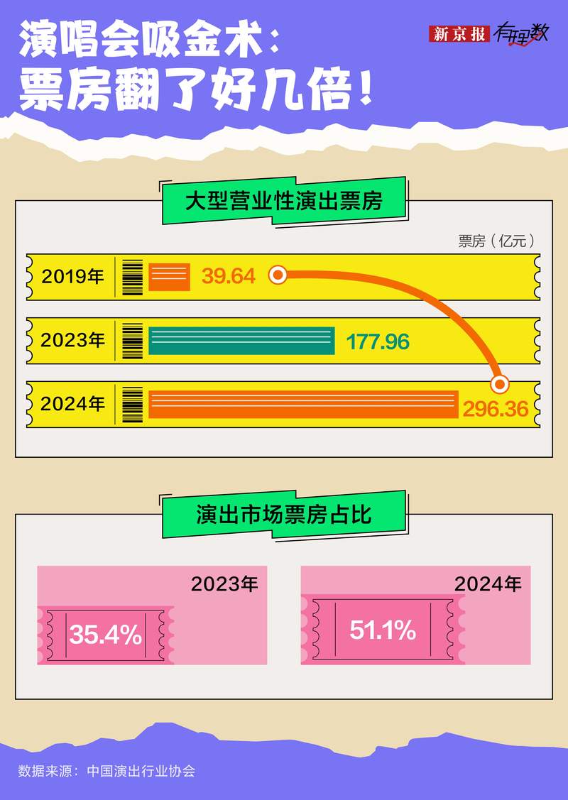 2024年,大型营业性演出票房收入高达 296.36 亿元,对比2019年,足足翻了7倍多。演唱会的票房占比更是拿下了演出市场的半壁江山。