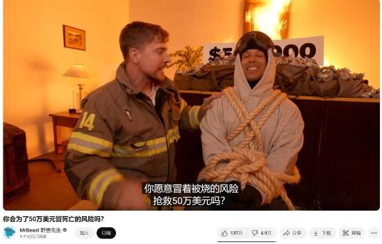 在他举办的新挑战中,参赛者需要在烈焰包围的密室争夺50万美元(约365万元人民币)奖金。视频开头的旁白直接抛出灵魂提问:"你愿意冒着被烧的风险抢救50万美元吗?"