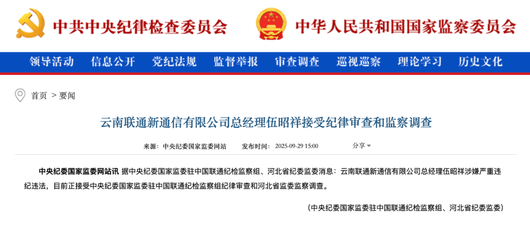 据中央纪委国家监委驻中国联通纪检监察组、河北省纪委监委消息:云南联通新通信有限公司总经理伍昭祥涉嫌严重违纪违法,目前正接受中央纪委国家监委驻中国联通纪检监察组纪律审查和河北省监委监察调查。
