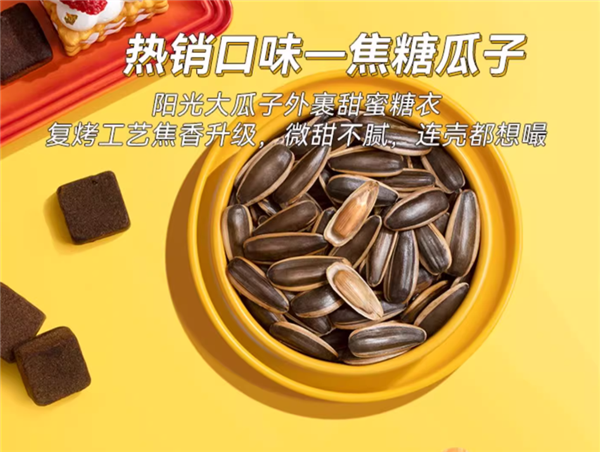 阳光大瓜子外裹甜蜜糖衣,复烤工艺焦香升级,微甜不腻。