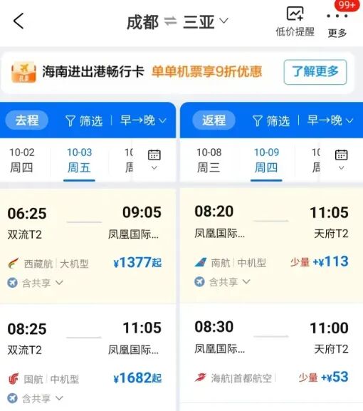 或许是节中的微错峰,以成都-海口、三亚等地的机票为例,旅界查询发现10月3日出行,10月9日返程,往返机票可以控制在1500元以内。