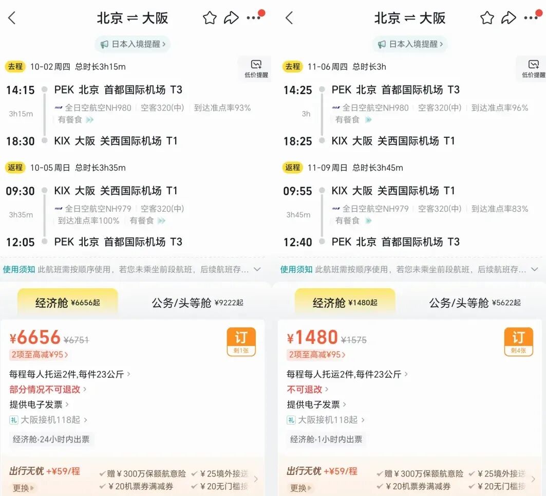 另一类是长线出境游客,发现机票已经呈现近几年前所未有的天价机票,北京欧洲经济舱机票直逼3万元,也有人对比北京—大阪的机票,比平时直接翻4倍还拐弯了,连连感慨假日经济太可怕了。