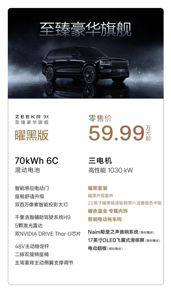新车配备曜黑套装,包括曜黒外观套件、22英寸曜黑锻造轮毂带六活塞橙色卡钳、暗夜鎏金专属内饰、智能电动拖车钩等。极氪9X 曜黑版适合追求个性化的用户。